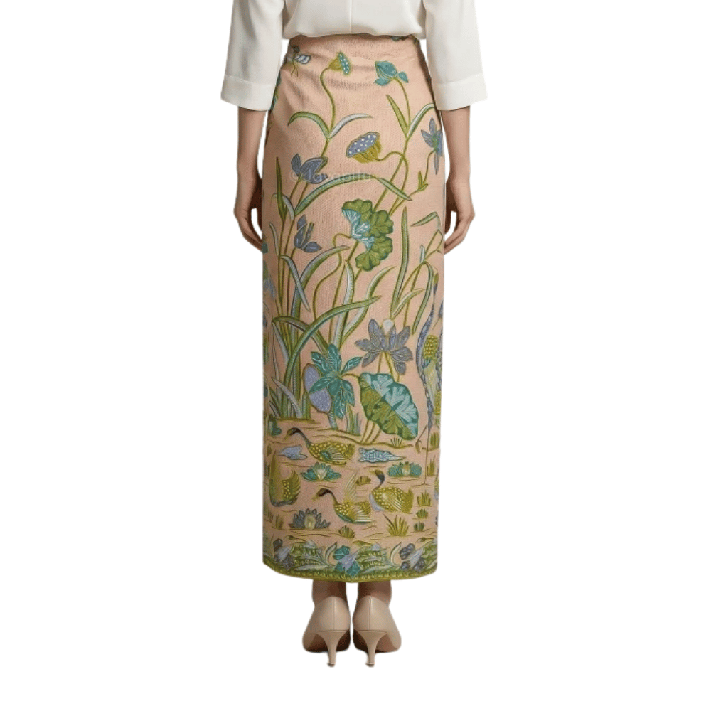 LotusGarden Harmony Premium Cotton Batik Fabric Sarong made with premium cotton for smooth touch and breathable comfort. Size: width 95–110cm, length 175–200cm. The floral batik composition pairs beautifully with pastel tops, kebaya, or neutral blouses. Suitable for weddings, open houses, cultural events, and daily styling as a wrap skirt, shawl, or shoulder drape.