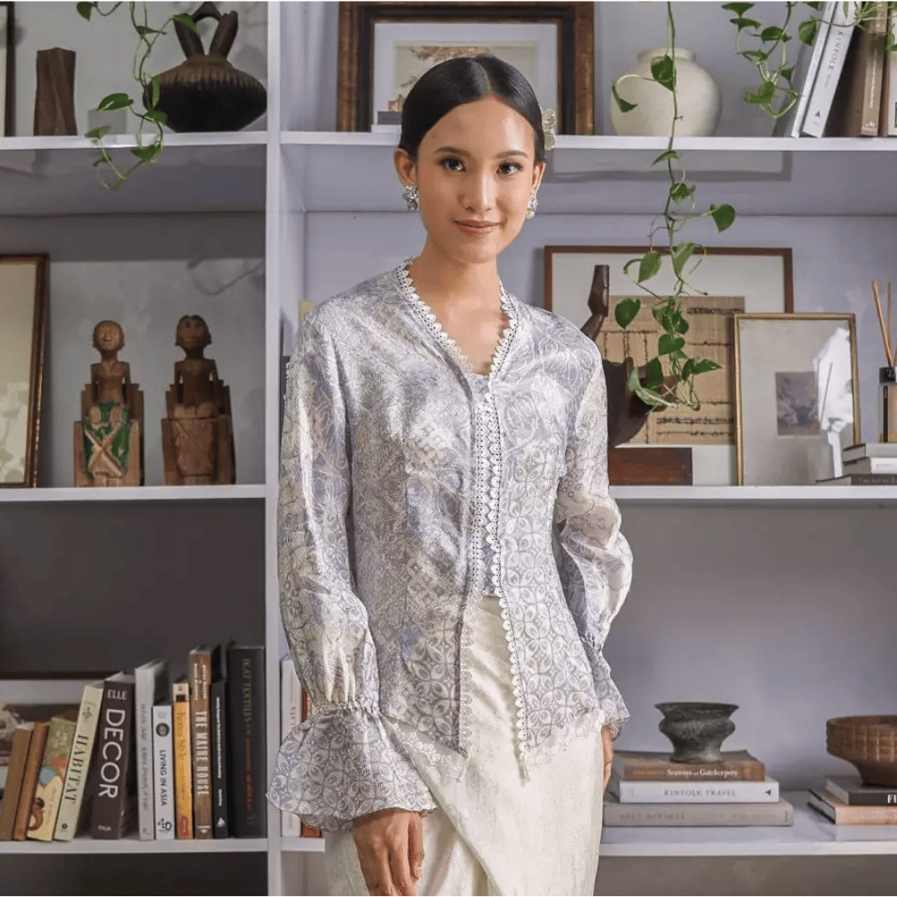 Bring a classic Malaysian look to your wardrobe with this lace-trim batik kebaya top. Lightweight and comfortable for our weather, it features a flattering open-front cut, soft lace edging, and a beautiful grey batik print. Style it with a kain, skirt, or tailored pants for festive events, office days, or weekend outings.